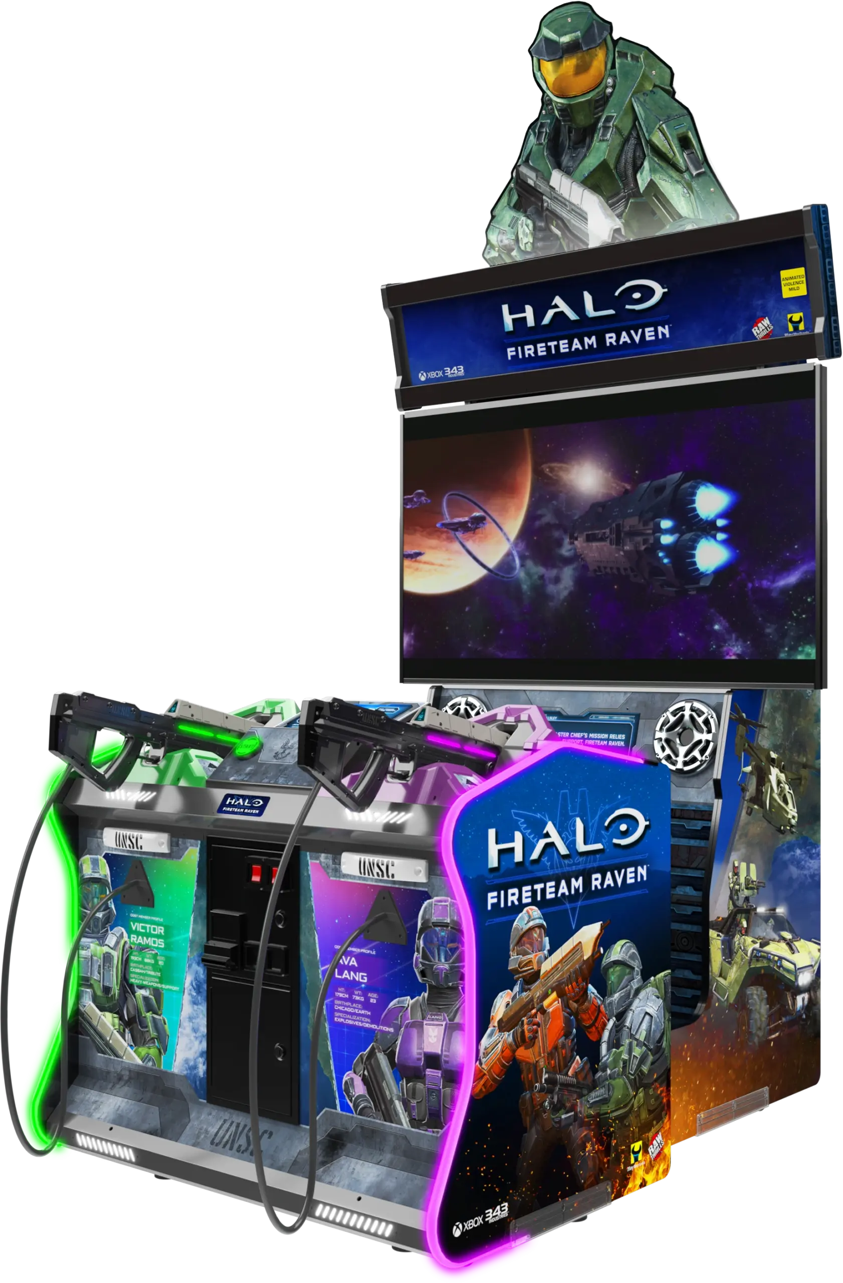 El compacto y fácil de usar gabinete Tethered Gun para 2 jugadores cuenta con una pantalla de 55 pulgadas de vanguardia y dos armas con retroalimentación de fuerza inspiradas en el clásico rifle de asalto de Halo. Debido a la gran demanda, Halo: Fireteam Raven también está disponible en otros formatos, incluyendo la edición Tethered Gun para 4 jugadores y la edición ambiental para 2 jugadores.