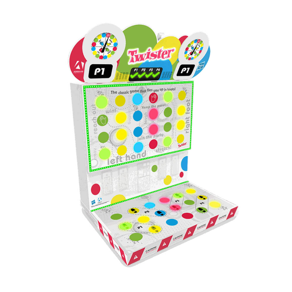 Twister es un juego arcade que presenta la misma jugabilidad que el clásico juego de fiesta, pero con algunos giros y vueltas. Hasta 4 jugadores tienen que adoptar posiciones cada vez más difíciles colocando los pies sobre puntos rojos, azules, amarillos y verdes del suelo. También tienen que colocar las manos sobre los puntos de colores de la pared. ¡La ruleta empieza a girar! Las posiciones que deben tomar los jugadores se muestran en dos pantallas y se anuncian en voz alta. Los jugadores intentan entonces reproducir las posiciones indicadas: pie derecho rojo, buen comienzo. Pie izquierdo verde, ¡lo tienes! Mano izquierda azul… Espera, ¿es eso factible? ¡El último en pie gana! Las familias pueden unirse a la diversión juntas.
